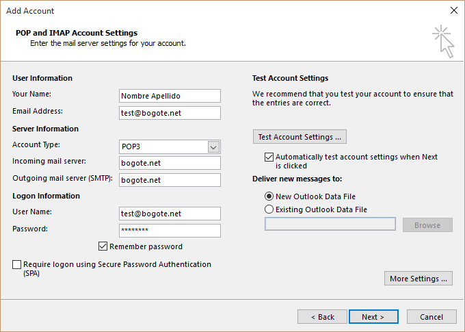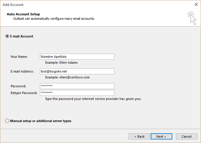 Servidor de entrada y salida: Puede utilizar su dominio (Ej. bogote.net) o anteponer "mail." (Ej. mail.bogote.net) ambos funcionan.