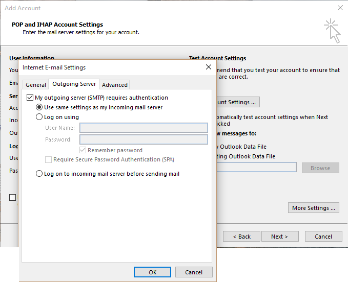 En Servidor de Salida active la opción Mi servidor de salida (SMTP) requiere autenticación.