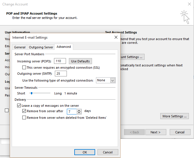 Se recomienda activar la opción Eliminar los mensajes del servidor después de 7 días para optimizar el uso del espacio en el servidor.